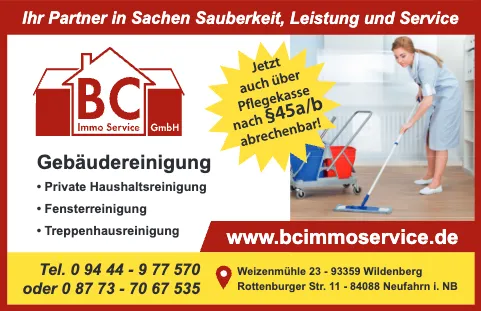 Seit 2015 wachsen wir stetig und haben 2017 einen wichtigen Schritt gemacht. Der Bereich Instandhaltung und Pflege wurde zur eigenständigen Firma, der BC IMMO SERVICE GMBH. Egal ob Einfamilien- oder Mehrfamilienhaus, Büro oder Lagerhalle - wir sind Ihre Experten für Hausverwaltung, Gebäudereinigung und Hausmeisterservice. Als anerkanntes Unternehmen sind wir berechtigt, nach § 45A abzurechnen. Vertrauen Sie auf unsere professionelle Betreuung Ihrer Immobilien. BC IMMO SERVICE GMBH - Ihr Partner für erstklassige Immobilienbetreuung